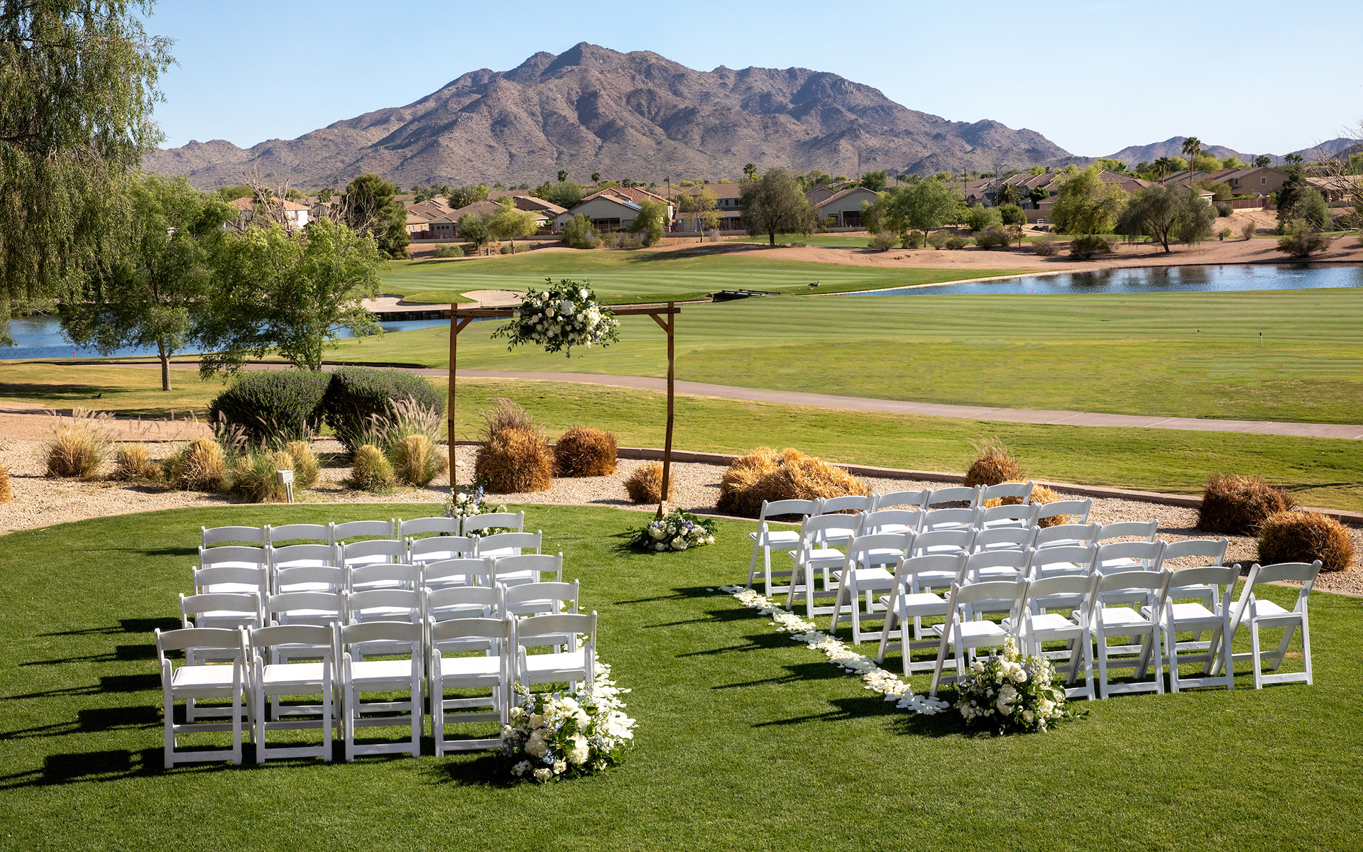 Seville’s vast but intimate clubhouse is the perfect Gilbert wedding venue for capturing your memories amid the travertine tile, 50-foot bell towers, large arching entryways, and expansive terraces. The Cascada Ballroom overlooks the event lawn and 18th hole with its sweeping views of the San Tan Mountains, sparkling lake and lush orange groves that have grown nearby for decades. Seville offers the perfect Gilbert wedding backdrop to promise love and commitment as you celebrate your special day.
